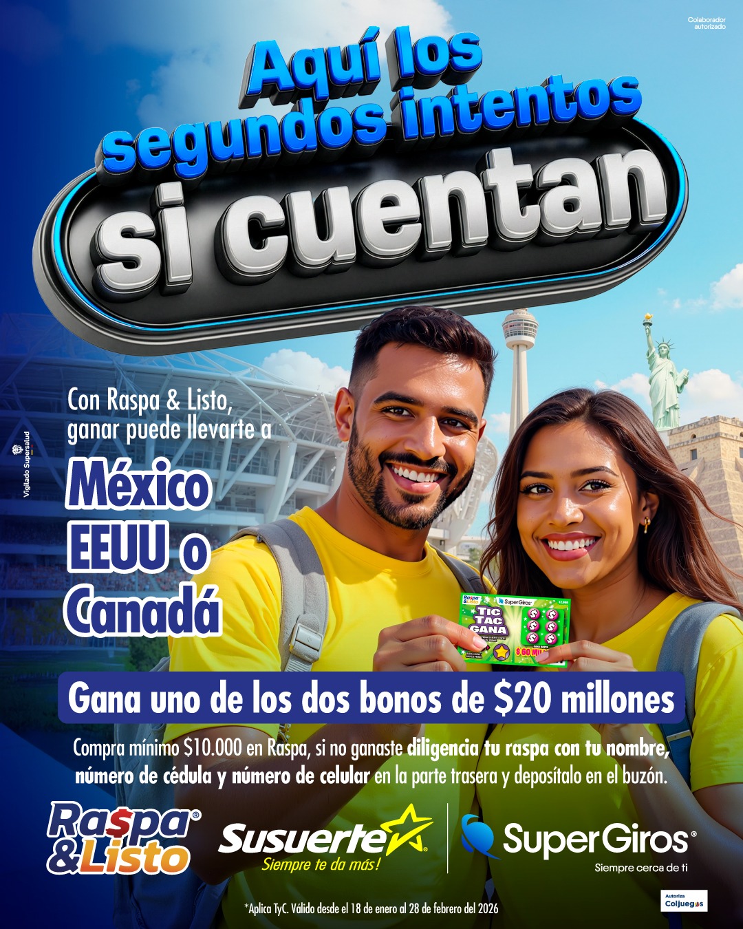 Del 18 de enero de 2026 al 28 de febrero de 2026, cada vez que compres tu Raspa y Listo y sean no ganadores tendrás un segundo chance  y podrás participar en un súper sorteo que te puede llevar a México, Estados Unidos o Canadá en 2026.