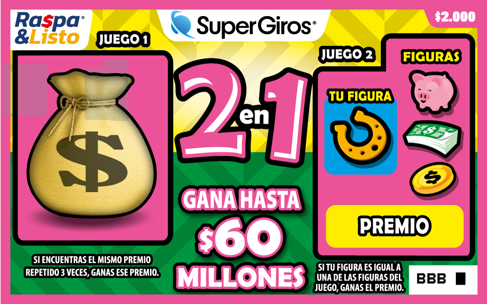 Gana hasta $60.000.000 Raspa el área de cada juego.Si el mismo premio se repite 3 veces ganas ese.