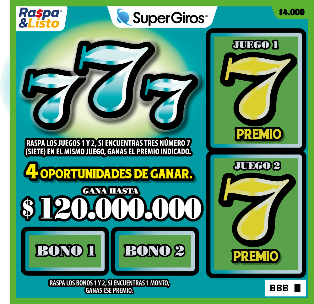 Raspa los juegos 1 y 2, si encuentras tres número 7 (siete) en el mismo juego, ganas el premio indicado.
