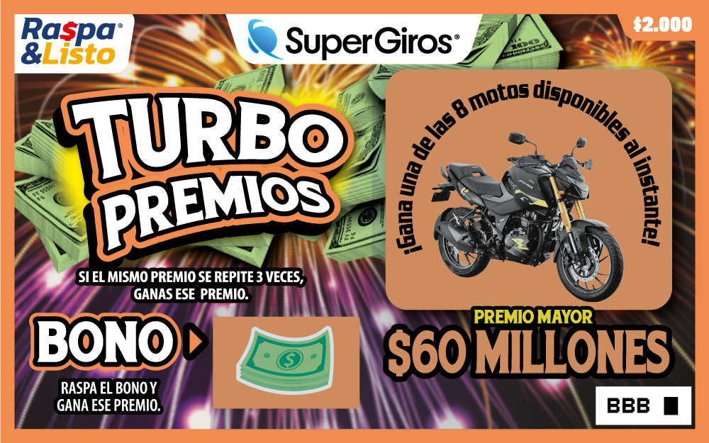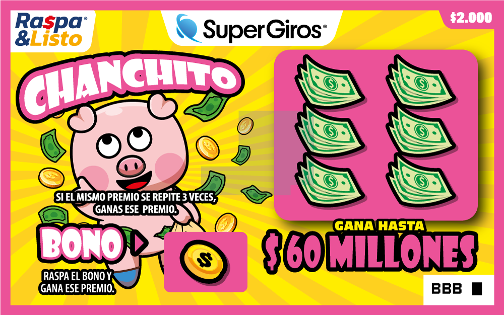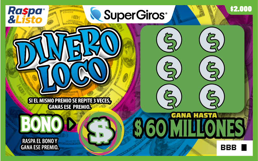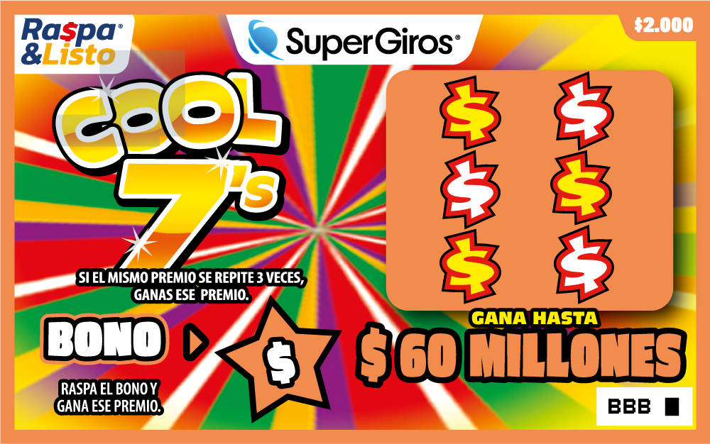 Gana hasta $60.000.000 Raspa toda el área. Si alguno de tus números coincide con el número ganador, ganas el premio de ese número.Incluye bono