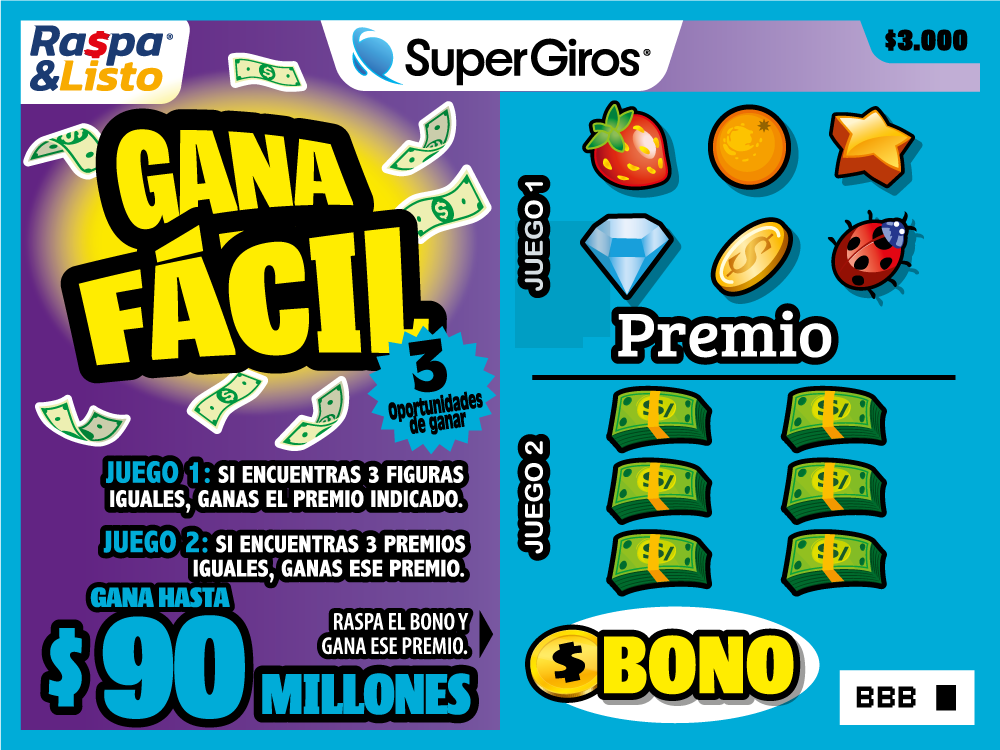Gana hasta $60.000.000 Raspa el juego. Si encuentras el número tres (3) repetido 3 veces, ganas el premio indicado.Incluye bono