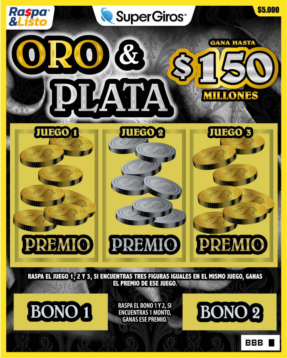 Gana hasta $60.000.000 Raspa la zona de juego. Si encuentras 3 cantidades iguales, ganas esa cantidad.