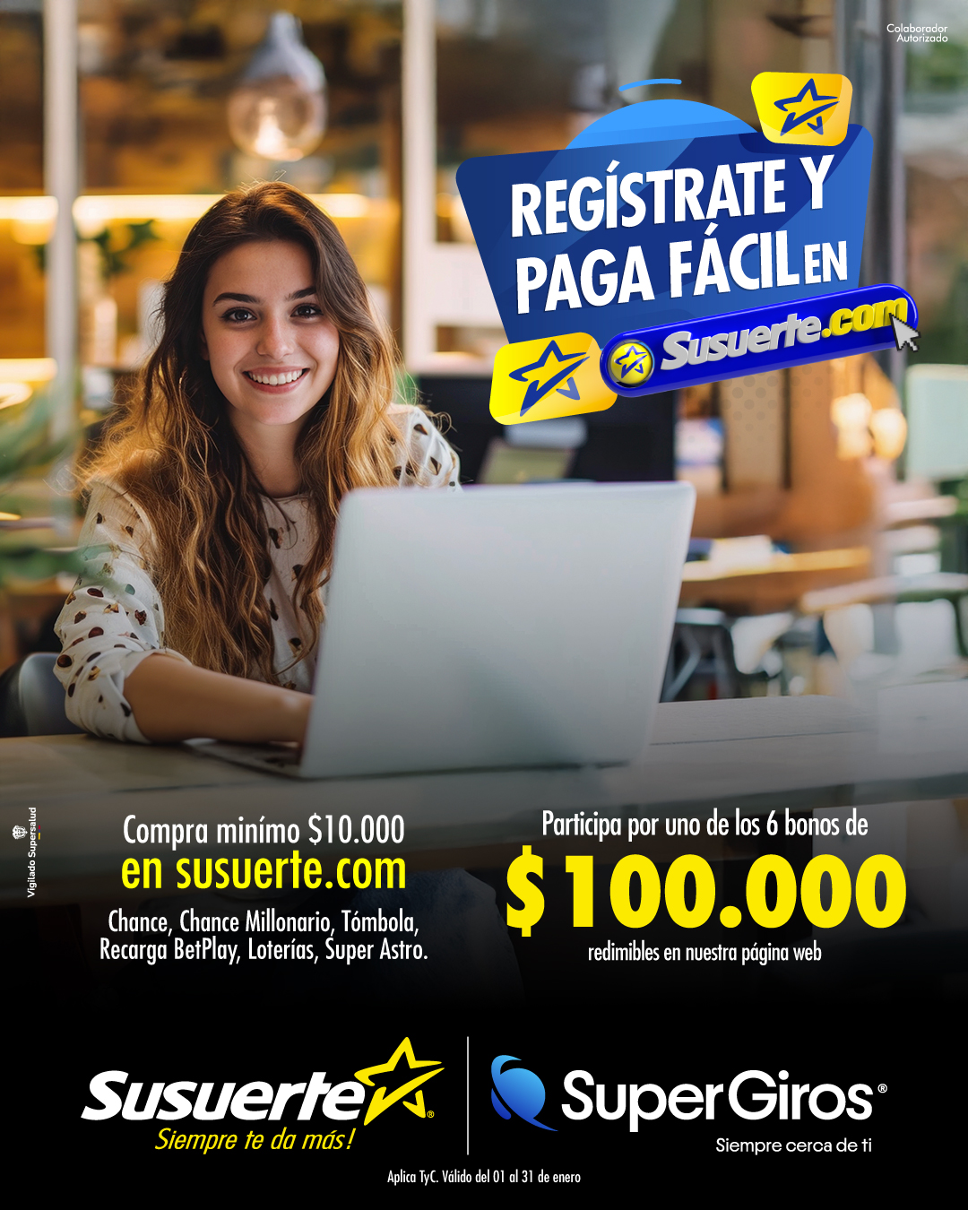 Todo cliente que se registre en www.susuerte.com en el mes de enero y realice compras (de mínimo $10.000 por cada carrito de compras) de los productos: Super Astro, Chance, Chance Millonario, Tómbola, Loterías, y recargas BetPlay en susuerte.com participa por uno de los seis (6) bonos de $100.000 (cien mil pesos) cada uno redimibles en la web.